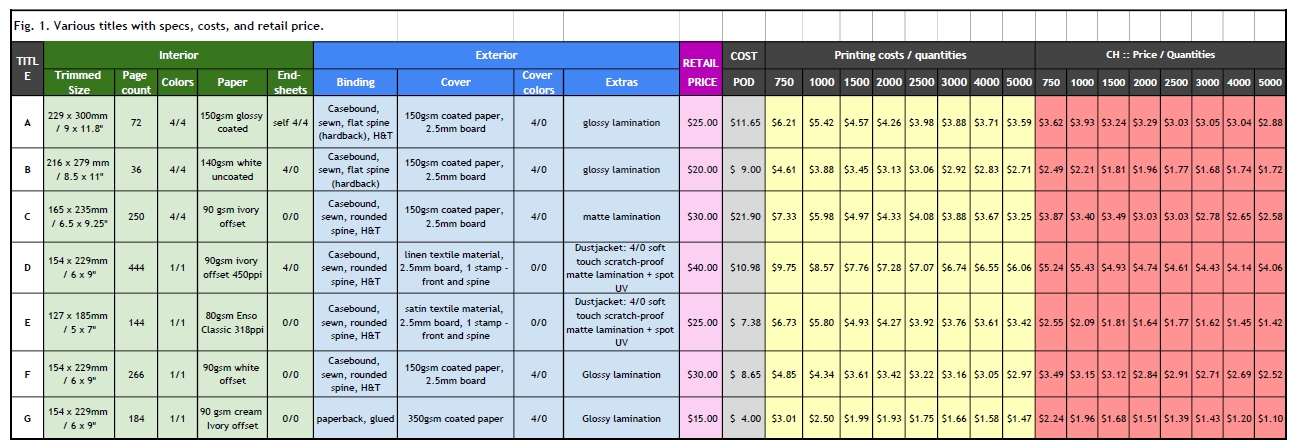 First of all, we selected seven titles (A to G) we’ve printed recently. In Figure 1, you can find their specs. As you see, almost every offset-printed book had various features unavailable at POD: spot UV, linen or satin textile covers, dust jacket, rounded spine, foil stamps, and soft-touch lamination. We decided to leave the costs as is with these features even though it plays for POD. Certain sizes are unavailable with POD, so we used for comparison the closest sizes available.