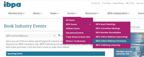 ibpa-online.org → Events tab → IBPA Events → IBPA Online Webinars (Previous) and look for: