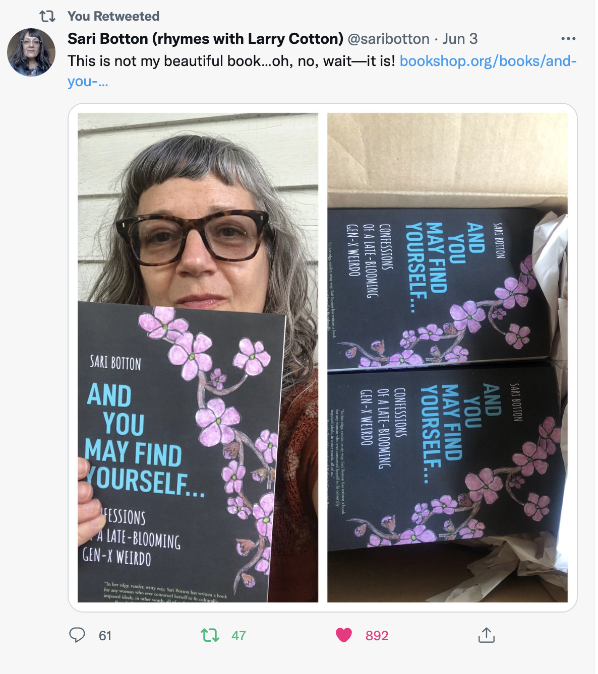 Sari Botton shares her stunned disorientation and delight on Twitter, when boxes of her memoir are delivered to her in June 2022. At her request, the book cover was designed.