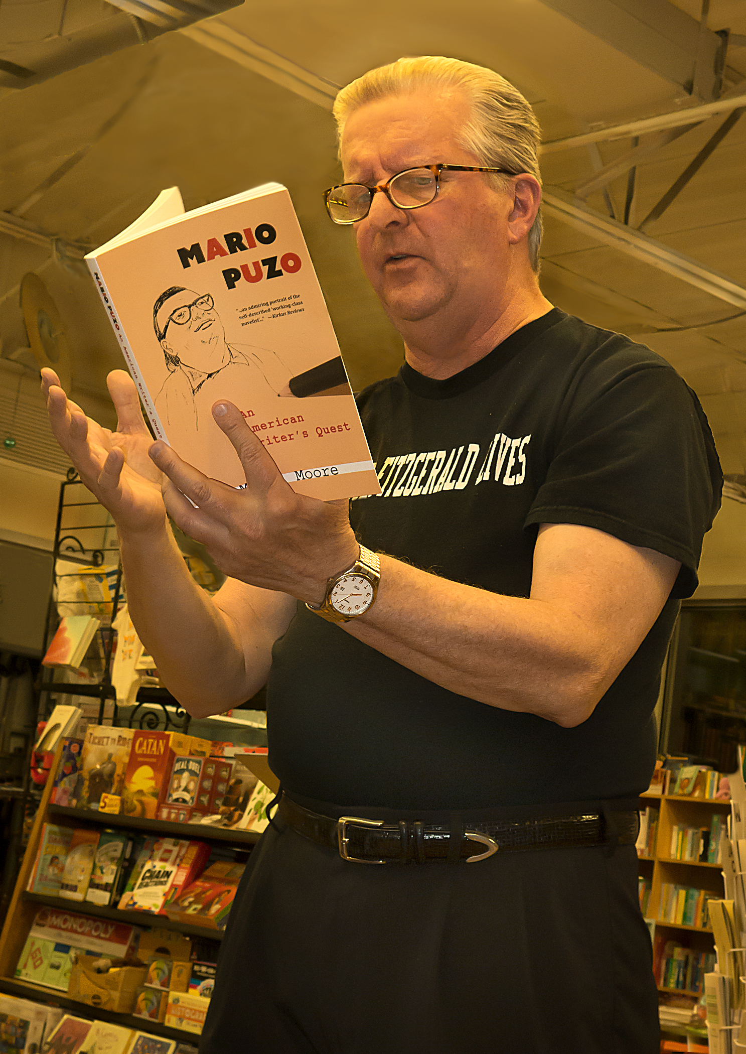 M. J. Moore reads from his literary biography of Mario Puzo at Book Culture in Manhattan, 2019. Photo by Judy Rosenblatt.