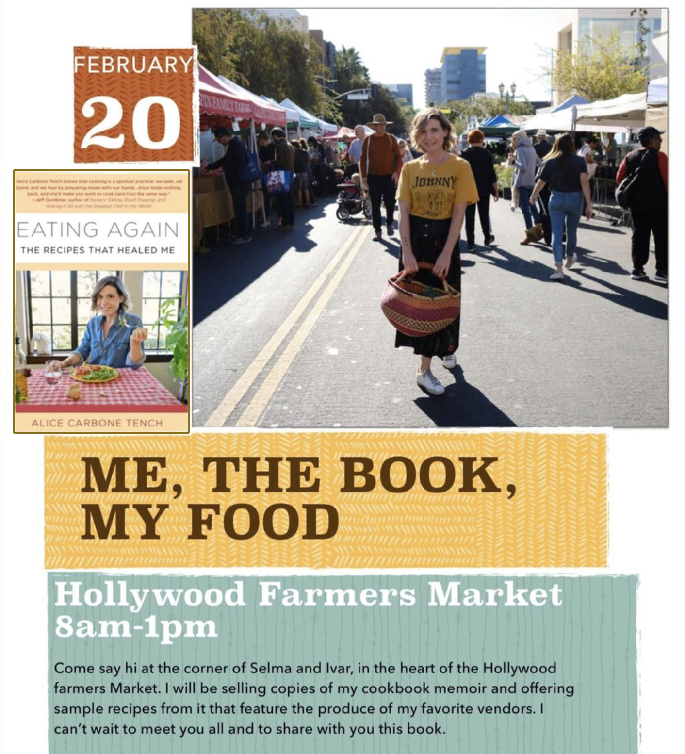 Alice Carbone Tench takes advantage of the outdoor farmer’s market in Los Angeles to promote and distribute her cookbook in February 2022.
